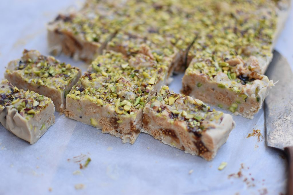 Kanen met Krant: Witte chocolade- en chalvataart met koekjes en cognacvijgen