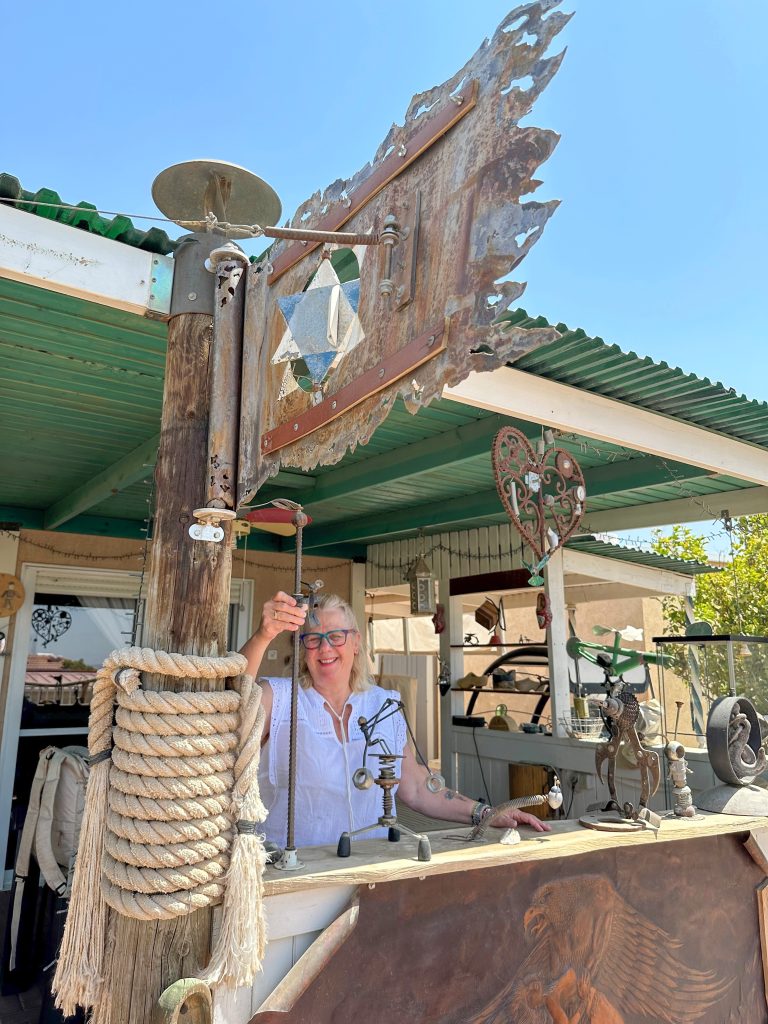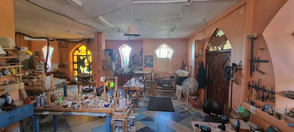 In een ervan treffen we Dahlia, die al decennialang hout bewerkt. Eerst is ze wat wantrouwig, maar gevraagd naar haar werk tovert zij een brede glimlach tevoorschijn en vertelt zij honderduit. Natuurlijk is het eindresultaat van haar handarbeid te verkrijgen in de kibboetswinkel, een van de andere ruimtes om de toren, waar we meteen naartoe worden meegetroond. Daar zien we niet alleen haar artefacten, maar ook glas in lood, geweven stoffen, keramiek, schilderijen en sieraden. Allemaal producten van deze ateliers. Als toerist kun je een soort retraite houden in de kibboets, inclusief een workshop in de verschillende disciplines.