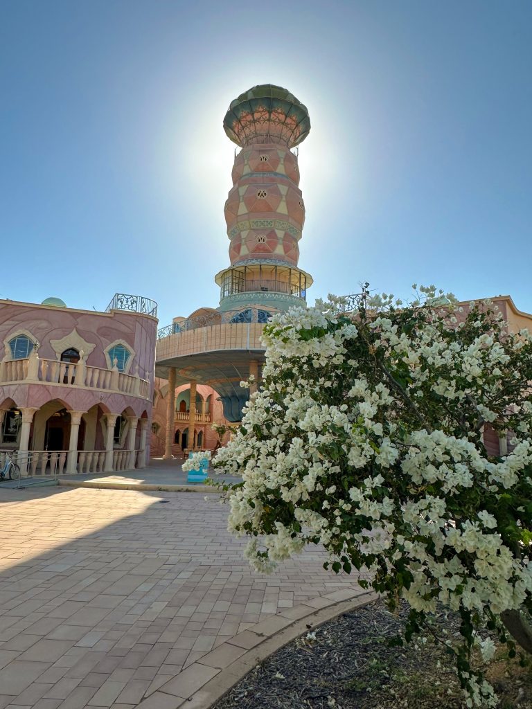 Zo’n zestig kilometer ten noorden van Eilat, bekend om de hippiementaliteit die er nog altijd op plekken als het Dolfijnenrif te vinden is, ligt een kibboets die zich richt op creativiteit en persoonlijke ontwikkeling. Als we de auto op de vroege ochtend parkeren in Neot Semadar, is het er doodstil. Wij lopen ongehinderd het terrein op, dat wordt gedomineerd door een opvallend bouwwerk. Het is een toren die je qua stijl eerder in het modernistische Park Güell in Barcelona zou verwachten. Oké, laten we er niet omheen draaien: het lijkt een enorme fallus van Gaudí, gehuld in snoezige pastelkleurtjes.