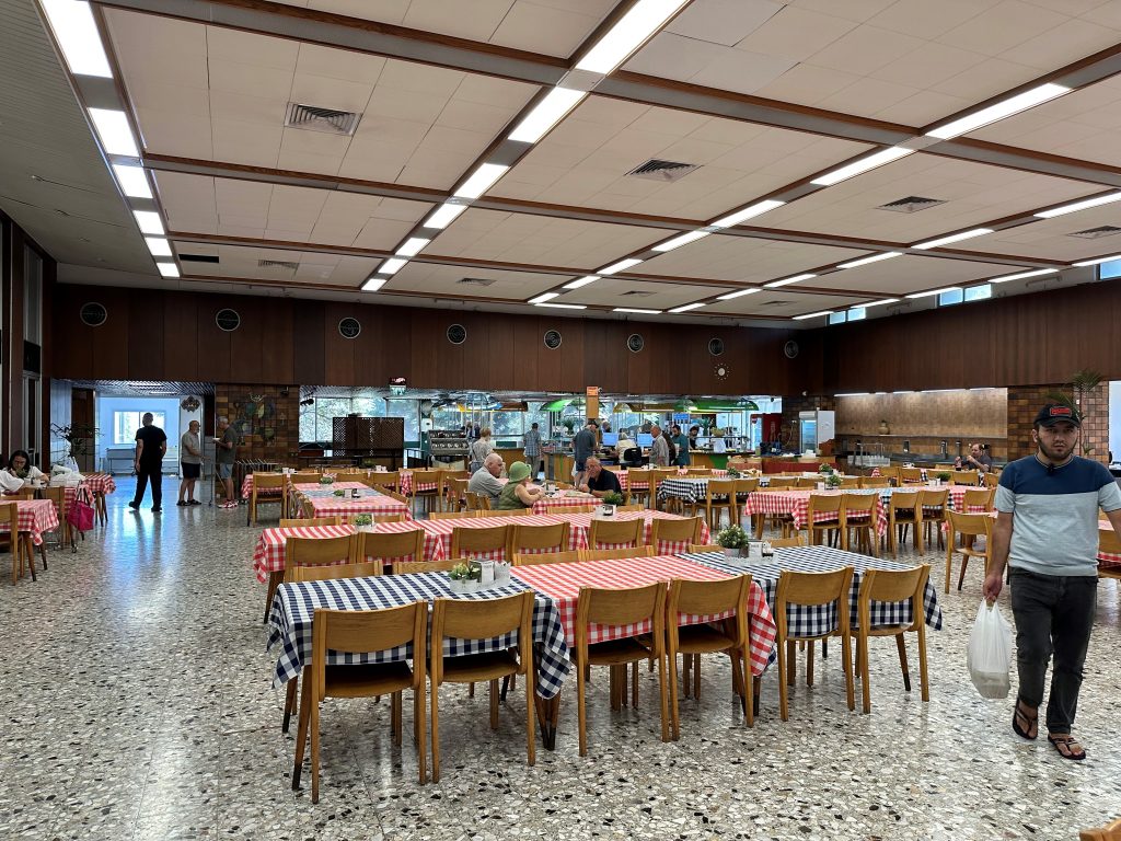 Vissel gaat ons voor naar het hart van de kibboets: de gemeenschappelijke eetzaal, een fenomeen dat in veel kibboetsen verdwijnt naarmate het collectieve aspect van het samenleven op de achtergrond raakt.